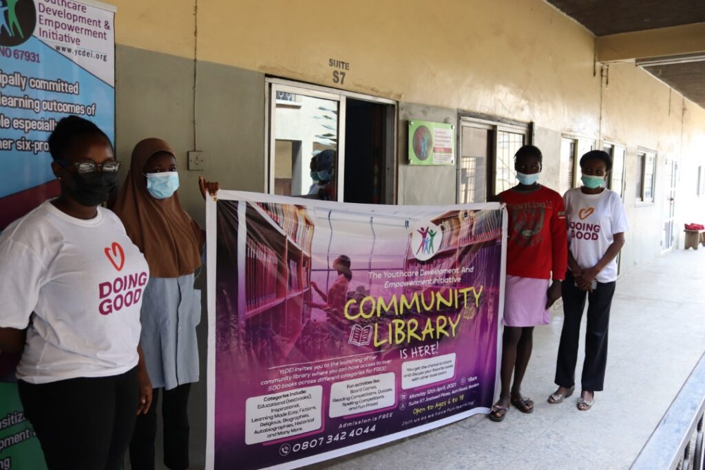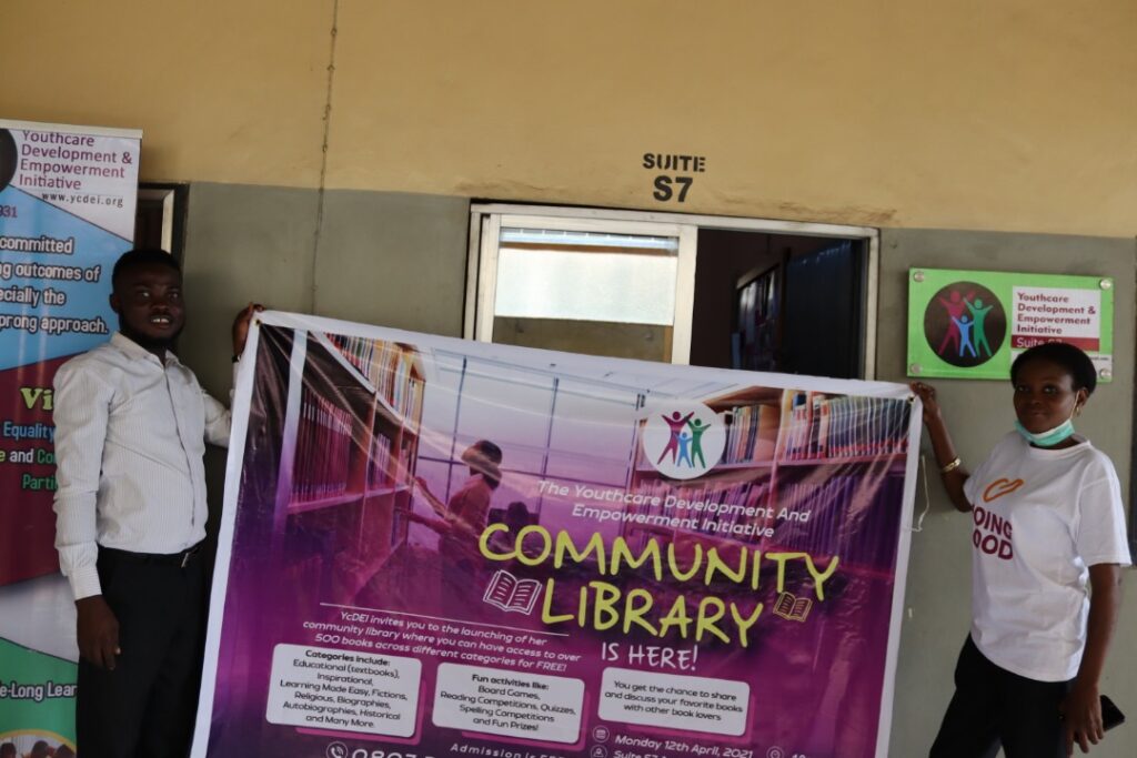 In the bid to give back to the society, Ycdei launches her community library on the 12th of April 2021. The library is to serve as a means to improve the reading culture and enriching the minds of young people in and around the community. The library was commissioned by Reverend Elekima Ekine one of the board members of Youthcare Development and Empowerment Initiative. The library opens on Mondays, Wednesdays and Fridays from 10am to 2pm.