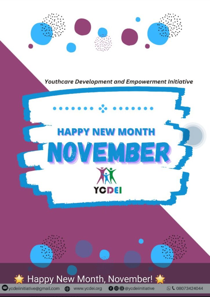 Youthcare Development and Empowerment Initiative (YCDEI) welcomes you to a fresh start this November! As we step into this new month, letβs embrace new opportunities, inspire positive change, and empower each other to make a difference.
